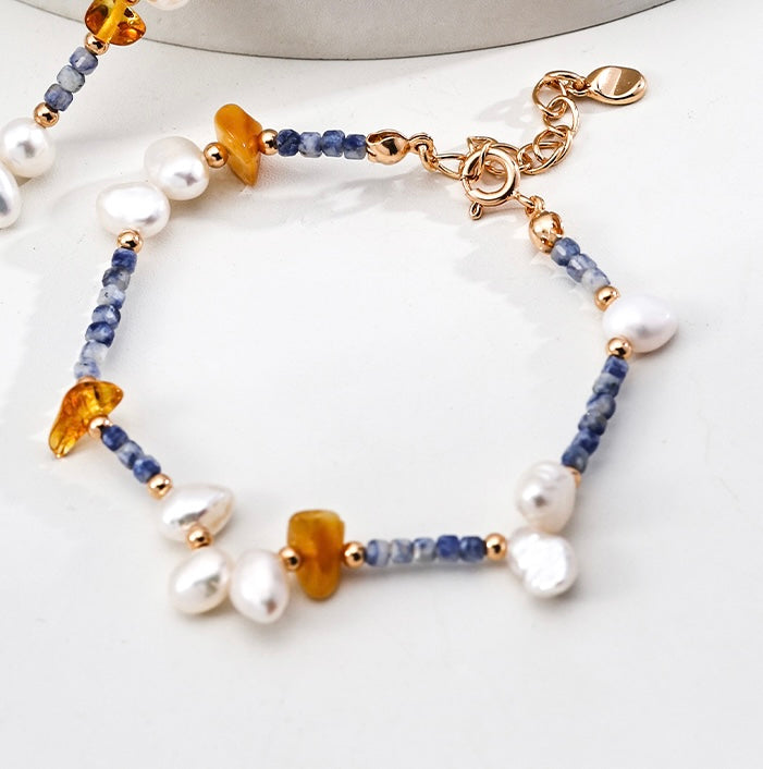 Let your spirit soar with Ciel d’Or, a luminous pairing of golden amber, deep blue dot stones, and organic freshwater pearls. Inspired by the horizon where the sun kisses the sea, this set brings warmth, calm, and timeless elegance to any look.