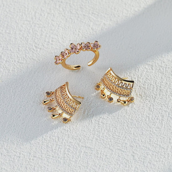 Delicately crafted, the Fleur Cluster Ring captures the soft elegance of blooming flowers in a graceful open-band design. Each glazed blossom is kissed with a hint of blush pink, radiating femininity and charm. Perfect for stacking or wearing solo, this piece effortlessly adds a touch of spring to your everyday style.