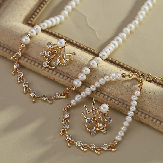 A delicate fusion of timeless elegance and modern charm, the Lumière necklace features luminous freshwater pearls accented with a graceful swirl of sparkling stones. Perfectly balanced between classic and contemporary, this piece effortlessly elevates any look—from crisp white shirts to evening attire. A refined statement of sophistication for the modern muse.