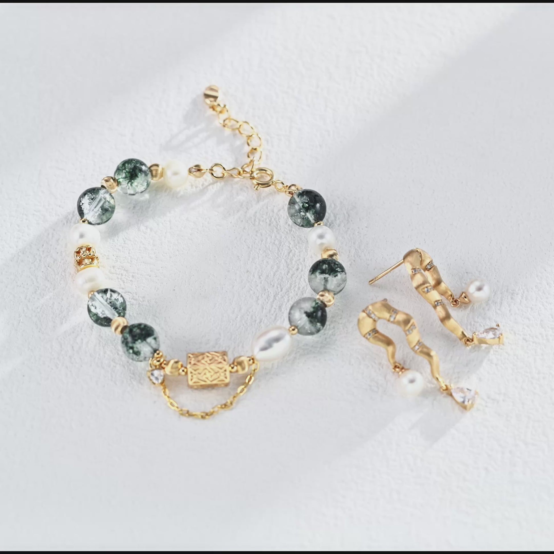 A refined blend of moss agate, freshwater pearls, and gold detailing.